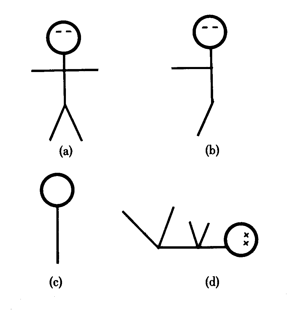Human subjects were asked to rate on a happy/sad scale how they would feel after the loss of factorially deleted parts of their bodies. To help them make these judgments, drawings corresponding to their supposed disabilities were presented along with vivid verbal descriptions. An example of an undisabled person is in Fig. 1a; while one missing an arm and a leg is depicted in Fig. 1b. A picture of the worst possible nonterminal deletion of parts is in Fig. 1c. Dead figures were represented as lying down, with x's in their eyes (regardless of whether they had lost any eyes), Fig. 1d.